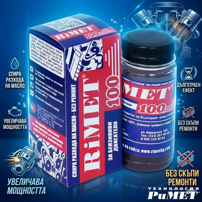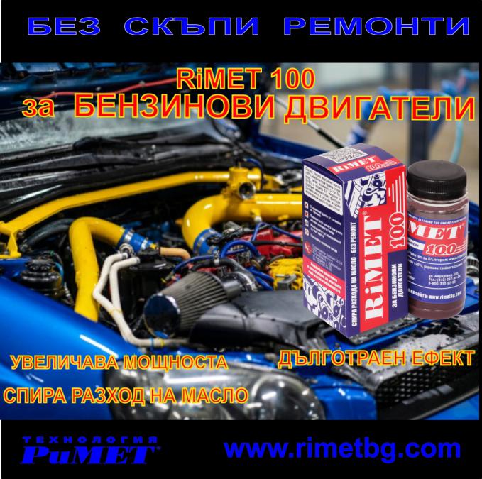 РиМЕТ 100 - НОВА НАУЧНА РАЗРАБОТКА РЕМЕТАЛИЗАНТ ЗА БЕНЗИНОВИ ДВИГАТЕЛИ ✅Възстановява износването на двигателя – без ремонт. ✅Увеличава компресията и мощността. ✅Подобрява студения старт на двигателя при ниски температури. ✅Спира разход на масло в буталната група. ✅Намалява разход на гориво до 10 %. ✅Съвместим с всички видове масла. ✅Намалява шум и вибрации на двигателя. ✅1бр. - 54лв. КАЧЕСТВОТО се гарантира единствено от Официалния Представител за България: Провижън ЕООД.. Доставка за цялата страна чрез куриерска фирма ЕКОНТ. За техническа консултация и поръчки: тел.: 0878 846 565 - инж. Д. Раленеков |