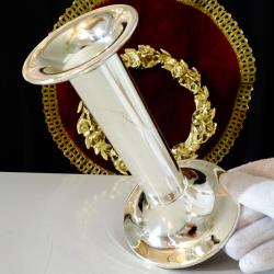 Дизайнерска коктиера, поставка за яйца, изработена от три старинни посребрени лъжици с маркировки. Подходяща е и за троен свещник, пепелник, солница и др. От маркировката на лъжиците се разбира, че всяка от тях е посребрена с 20 грама сребро. Височина 6 см., диаметър 16 см., тегло 185 гр.