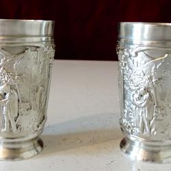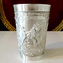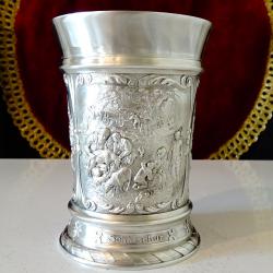 Старинен немски бокал, халба, майсторска ръчна изработка от 95% калай и 5% сребро, маркиран. Има три релефни картини – ловец с пушка и дивеч, красива сърна и млад сръндак, два Елена – горд победител и победен. Всяка сцена е обградена с барокови орнаменти и цветя. Височина 10 см., диаметър 6.5 см., тегло 240 гр. Вместимост 180 мл. Имам и един по-голям бокал със същите картини, който може да разгледате в моите обяви. |