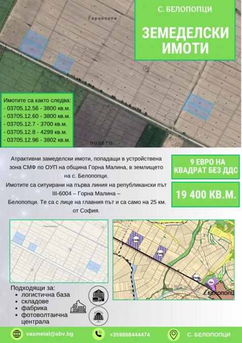 Продават се земеделски имоти попадащи в устройствена зона СМФ по ОУП на общ. Горна Малина, в землището на с. Белопопци. Имотите са атрактивни и са с лице на главния път, само на 25 км от гр. София. Подходящи за изграждането на фотонолтаичен парк, логистичен център, складова база, фабрика и др.