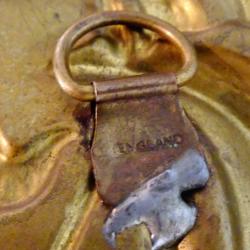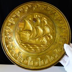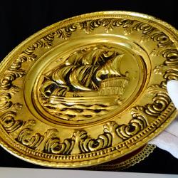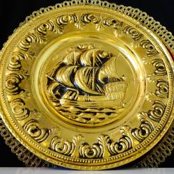 Старинна английска чиния за стена, пано за стена, майсторска ръчна изработка от як бронз с качествена дебела позлата. Има релефно кована картина с изображение на английски боен кораб, линеен кораб, платноход, сред океански вълни. Периферията е декорирана с красиви релефни орнаменти. Има окачалка за стена и маркировка England. Диаметър 30 см., височина 3 см., тегло 280 гр.