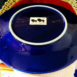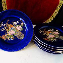 Баварска порцеланова чиния, чиния баварски порцелан, ръчно рисувана с двойка пауни от 24 карата злато, сред пъстри цветя на мастилено син кобалтов фон. Периферията е декорирана с релефни барокови орнаменти на порцелана и дебел златен кант. Чинията не е ползвана има запазен етикет на производителя. Диаметър 18 см., височина 2 см..Налични 6 броя, цена 18 лв., за брой.