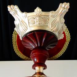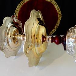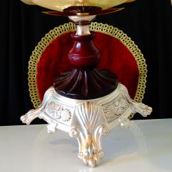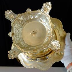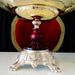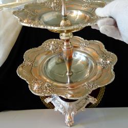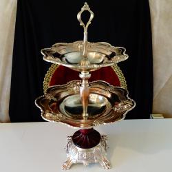 Стар викториански етажен поднос, плато, стойка, фруктиера, epergne, етажерка, двуетажна поставка за сервиране на сладки, кекс, мъфини, плодове, майсторска ръчна изработка от масивна мед, дебело посребрен с висока проба сребро. Декориран с прецизно изваяни релефни рози, цветя и най-красивите барокови орнаменти. Стои стабилно на основа с четири релефни крачета, като лъвски лапички. Великолепен централен елемент на трапезата, разкош за всяко събитие – сватба, юбилей, рожден ден, кръщене, бал и др. Височина 47 см., диаметър на голямата чиния 30 см., диаметър на малката чиния 23 см. Тегло 1.9 кг.