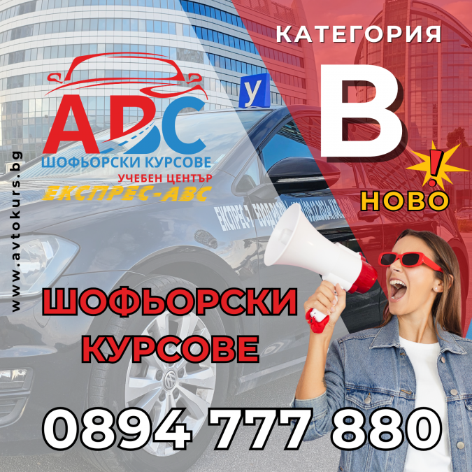 Започни шофьорския си курс сега! Не отлагай повече! Курсът при нас е бърз, приятен и без излишен стрес - напълно съобразен с твоя график! *Посочена е крайната цена на курса! +Кормуване в удобно време +Теоретично обучение в комфортна среда +Практически часове с опитни инструктори +Възможност за разсрочено плащане +Категории - В / А / А1 / А2 / С / С+Е / В+Е +Категория В (78) автоматик Свържи се с нас на тел. 0894 777 880 www. avtokurs. bg Facebook: Автошкола Експрес-АВС Instagram: avtoshkola. ekspresabc Необходими документи: - Лична карта / копие - Медицинско / копие - Снимка за документи - 1 бр. Oбучение: - Двуседмичен теоретичен курс; - Практическо обучение - 31 учебни часа; АДРЕСИ: гр. София жк. Младост 4, ул. ”Д-р. Атанас Москов” 439А 0894 777 880 гр. София Студентски град, ул. “Академик Борис Стефанов” 1, вх. А, ет. 1, офис №6 0894 777 882 гр. София Студентски град, ул. “Проф. Кирил Попов” 55, (срещу KAUFLAND) 0894 777 880 |