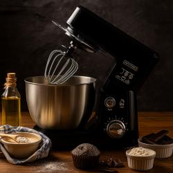 Мощност: 1000 W Max; Напрежение: 220–240V ~ 50/60Hz; Скорости: 6 степени; Купа: 4 литра, неръждаема стомана; Функции: месене, смесване, разбиване, пасиране; Аксесоари: кука за тесто, бъркалка, тел за разбиване; Размер: 25 см компактен корпус; Цвят: черен или червен; Поддръжка: купата е подходяща за съдомиялна машина; Гаранция: 12 месеца. |