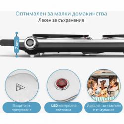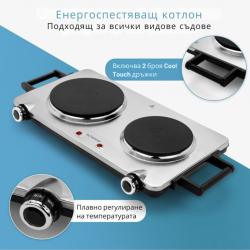 Мощност: общо 2500 W (1500 W + 1000 W); Плочи: 2 нагревателни зони; голяма: Ø 18 см, 1500 W; малка: Ø 15 см, 1000 W; Материал на корпуса: висококачествена неръждаема стомана; Контрол: плавно регулируем термостат; Индикация: LED контролни светлини; Защита: от прегряване + стабилни неплъзгащи се крачета; Допълнителни екстри: свалящи се Cool Touch дръжки; Размери: 59 x 28 x 7 см; Тегло: приблизително 4 кг; Захранване: 220–240 V, 50/60 Hz; Подходящ за: всякакъв вид съдове с плоско дъно; Поддръжка: лесно почистване с влажна кърпа; Гаранция: 12 месеца. |
