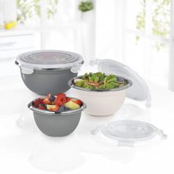 Марка: GOURMETmaxx Материал: Неръждаема стомана + пластмасови капаци със силиконов уплътнител Брой в комплекта: 3 броя купи с капаци Обем и размери: 1 × купа с капак: Ø 13 см × 6.8 см (500 мл) 1 × купа с капак: Ø 15.7 см × 7.9 см (800 мл) 1 × купа с капак: Ø 18.2 см × 9.2 см (1,350 мл) Уплътнение: 4-точково заключване с гумен пръстен Подходящи за: Съхранение в хладилник, замразяване, сервиране Почистване: Подходящи за съдомиялна машина Функции: Херметично съхранение, пренасяне без разливане, сервиране |