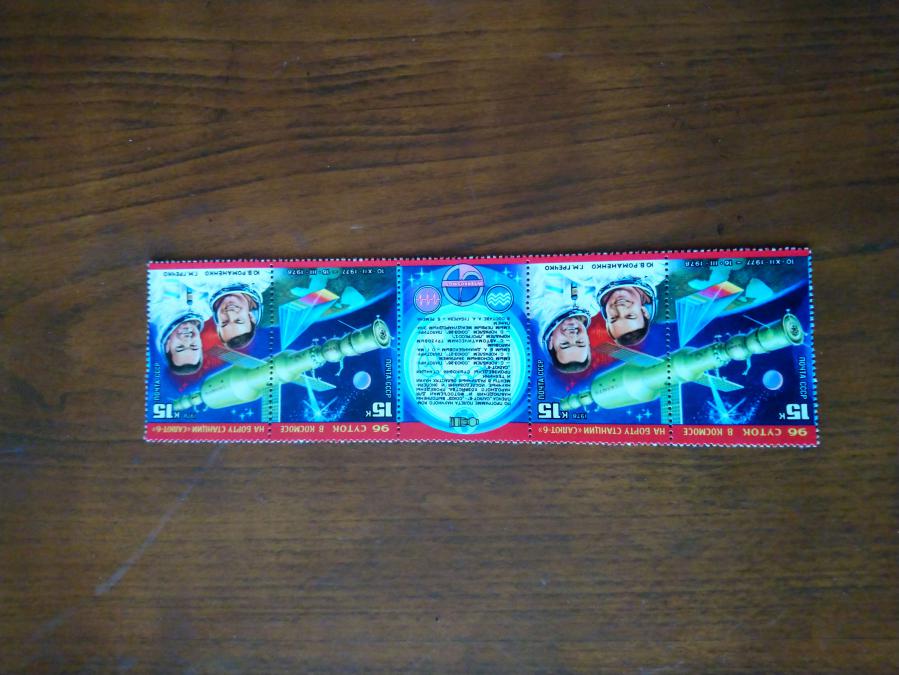 Серия от 2*2 пощенски марки с отделен надпис в блок от СССР1978 г. 96 денонощия в Космоса на борда на станция " Салют - 6 ".