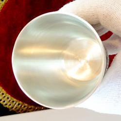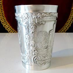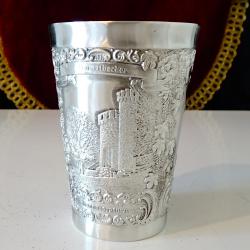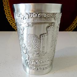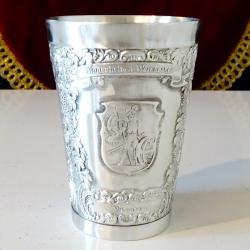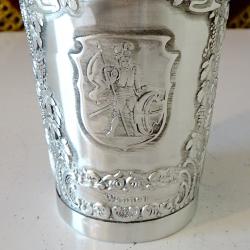 Старинна немска калаена чаша за вино, майсторска ръчна изработка от 95% калай и 5% сребро, маркирана. Декорирана с релефно изображение на Винар с чаша в ръка, Замък с вековни изби и Рицар с меч и копие. Картините са разделени от преплетени лози с узряло грозде и барокови орнаменти. Чашата блести като сребърна от вън и от вътре, перфектна за ползване, декорация, подарък за калаена сватба. Височина 9 см., диаметър 6 см., тегло 160 гр. Вместимост 160 мл.