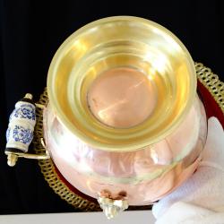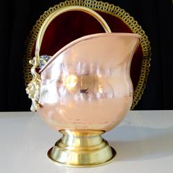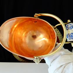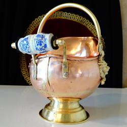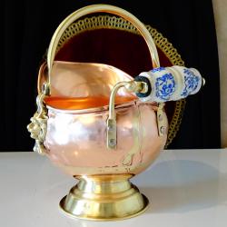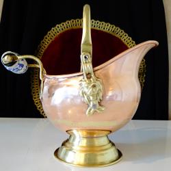 Старинен меден съд за въглища, поставка за бутилка, кана за вино, жардениера, менче, майсторска ръчна изработка от високо качествена чиста червена мед. Има две яки дръжки от златен бронз с релефни лъвски глави и дръжка от порцелан Делфт, ръчно рисувана с кобалтови сини цветя. Съда стои стабилно на основа от бронз. От вътре не е калайдисан, подходящ и за медна вода. Височина с дръжката 20 см., височина на съда 16 см., дължина 21 см., диаметър 14 см., диаметър на основата 9.5 см. Тегло 310 гр. Вместимост 800 мл.