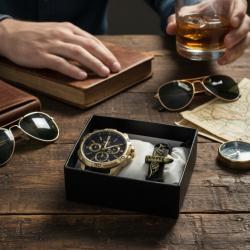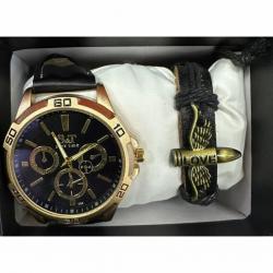 Марка/линия: S&T; Тип: Мъжки; Механизъм: Аналогов, с батерия (Quartz); Циферблат: Черен, златисти стрелки/индекси; декоративни субциферблати; Корпус: Метален, златисто покритие; безел с минутна скала 10–60; Каишка: Черна, тип еко кожа, закопчаване с катарама; Гривна: Плетена - амулет бухал или амулет куршум с крила + надпис LOVE; Поддръжка: Сменяема батерия; забърсване с мека суха кърпа; Предназначение: Подарък за рожден ден, имен ден, абитуриент, годишнина, Коледа или „просто така“. |