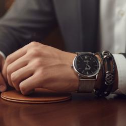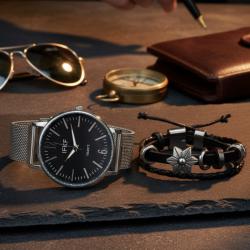 Мъжки комплект кварцов часовник с метална верижка и стилна гривна в