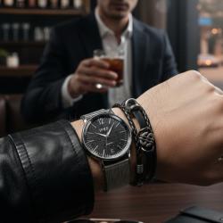 Марка/надпис на циферблата: IFKF; Механизъм: кварцов (надпис „QUARTZ“ = точност и без навиване); Циферблат: черен, контрастни сребристи индекси и стрелки; Корпус: метален, полиран; Каишка/верижка: метална мрежеста (mesh), регулируема закопчалка; Гривна: плетена, черна, с метални декоративни елементи - долар или звезда; Подходящ за: ежедневие, бизнес, подарък за мъж. |
