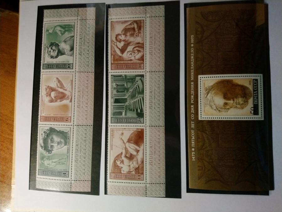 Серия от 6 пощенски марки плюс голяма пощенска марка блок от СССР 1975 г. 500 години от рождението на Микеланджело.