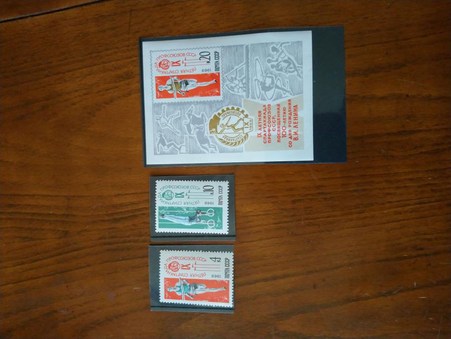 Серия от 2 пощенски марки плюс голяма марка блок от СССР 1969 г. ІХ лятна спартакиада на профсъюзите на СССР.