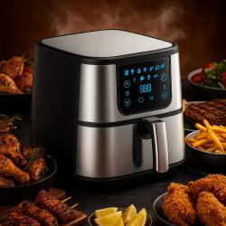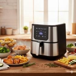 Модел: Scheffler LQ-5001BS; Тип: Еър фрайър / фритюрник с горещ въздух (Airfryer); Капацитет: 5.5 литра, „Double Basket“ (кошница с подложка за по-равномерна циркулация); Покритие на кошницата: незалепващо; Температурен диапазон: 80°C – 200°C; Таймер: до 60 минути; Мощност: 1600–1800 W; Захранване: 220–240 V, 50/60 Hz; Безопасност: защита от прегряване, противоплъзгащи се крачета; Поддръжка: свалящи се части, подходящи за съдомиялна машина; Функции: печене и „пържене“ с горещ въздух, бързо и равномерно разпределение на топлината, наблюдение през прозорец без прекъсване на програмата; Материали и изпълнение: неръждаема стомана + висококачествена пластмаса, LED контролен панел; Гаранция: 12 месеца. |