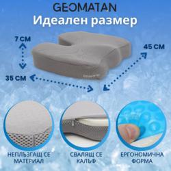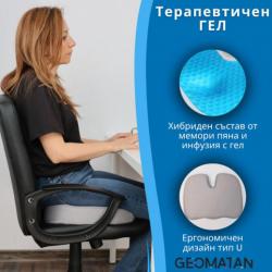 Тип: възглавница за седене, ергономична U-форма (tailbone/coccyx relief); Състав на ядрото: мемори пяна с повърхностен гел слой за охлаждащ ефект; Калъф: мек soft-fleece / дишащ текстил, свалящ се със цип, подходящ за машинно пране; Долна страна: анти-слип точки против приплъзване; Препоръчително натоварване: до 120 кг; Приложение: офис стол, домашен стол, автомобил, самолет, инвалидна количка; Ефект при употреба: подпомага правилната стойка, разпределя равномерно тежестта, намалява натиска върху опашната кост и лумбалната зона; Поддръжка: сваляне и пране на калъфа при 30 °C; вентилиране на пяната, без машинно пране/сушене на ядрото; Опаковка/маркировки по серията: “Gel + Memory Foam”, anti-slip base, washable cover; |