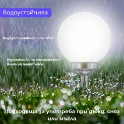 Тип: LED соларна градинска лампа на колче (сфера); Диаметър на сферата: Ø 30 см; Захранване: вграден соларен панел + акумулатор AA Ni-MH (включен); Режим на работа: автоматично включване по тъмно / изключване по светло (вграден сензор); Управление: превключвател ON/OFF (под капака – активирайте при първа употреба); Светлина: мека бяла, дифузна (360° разпределение); Препоръчително разположение: на открито слънчево място; избягвайте сянка от дървета и близост до улични лампи, които могат да „заблуждават“ сензора; Степен на защита: IP65 – за външна употреба, защитена от пръски вода; Монтаж: секционно стебло + назъбен земен шип (без инструменти); Сертификация: CE; Поддръжка: периодично почистване на соларния панел; при нужда подмяна на AA Ni-MH акумулатор; |