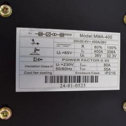 Продукт: Инверторен електрожен 400 A; Функции: регулатор 20–400 А с дисплей; вентилаторно охлаждане; бързи куплунги; работа без защитен газ; Захранване: U₁ = 230 V, 50/60 Hz; Регулируем ток: 20–400 A; Работен цикъл: 60% @ 400 A, 100% @ 308 A; Напрежение на празен ход: U₂ = 65 V; Фактор на мощността: 0.92; Клас изолация: H, степен на защита: IP21S; Съвместими електроди: Ø 2.0 – 5.0 mm (рутил, базични и др. MMA); Размери: 40 × 17 × 33 cm; Тегло: ≈ 5.5 kg; Екстри: FM/радио, Bluetooth, USB/TF четец, високоговорители; USB порт за флашка/зареждане; Комплектът включва: електрожен, лавица (държач) за електроди, щипка маса (заземяване), четка/чукче, базова защитна маска, инструкции; Допълнителни ползи: възможност за слушане на музика и заряд на телефон по време на работа. |