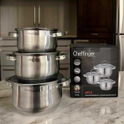 Марка: Cheffinger Материал: Алуминий с мраморно покритие Капаци: Закалено стъкло с термо-вентили Подходящи за: Всички видове котлони (вкл. индукционни) Приблизителни размери на съдовете: Тенджера Ø 20 см – около 2.5 л Тенджера Ø 24 см – около 4.5 л Тенджера Ø 28 см – около 6.5 л Касерола Ø 18 см – около 1.8 л Дълбока тенджера Ø 26 см – около 5.5 л |
