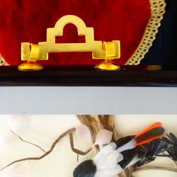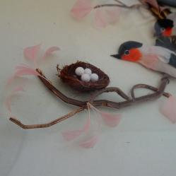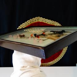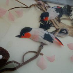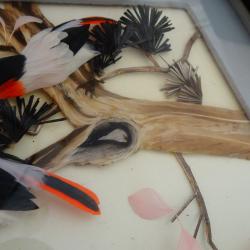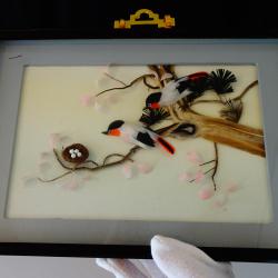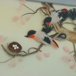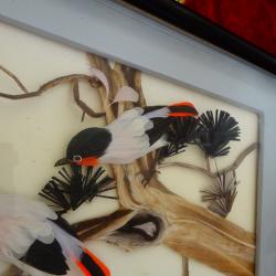 Стара китайска диорама, ръчно изработена от естествени птичи пера с рамка от естествено дърво и позлатена окачалка за стена. Представлява приказно красива 3D картина на две пъстри пойни птици, кацнали върху разцъфнало дърво, грижовно вперили поглед в гнездо с четири бели яйчица, вероятно нетърпеливи да видят своите малки птичета. Размер на рамката 31 х 22 х 2.6 см.