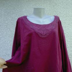Блузата е в много красив винен цвят, с плетена памучна дантела под деколтето Материя – 85% памук, 15% полиамид (трико) Европейски размер 52/54. По българският стандарт това е №58/60 Точни мерки БЕЗ разтягане: Дължина -76см.. шир. при подмишниците 2х72см. шир. при ханша 2х74см. шир. при раменете 2х48 см. Ръкав от рамото – 62 см. Нова. Без етикет. Още мои дрехи с големи размери в блога ми: https: //modamaxi. wordpress. com/ |