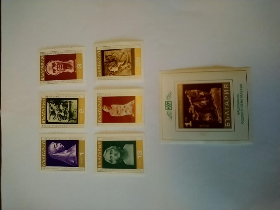 Серия от 6 пощески марки плюс голяма марка блок от България 1970 г. Скулптури от ационалната Галерия.