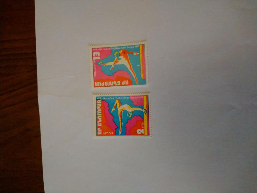 Серия от 2 пощенски марки от България 1974 г. ХVІІІ световно първенство по гимнастика.