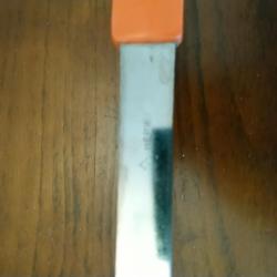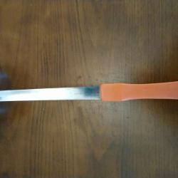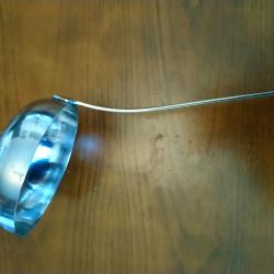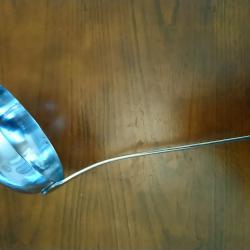 Черпак за супа голям с оранжева дръжка. Произход България 1990 г. Габаритни размери 320*130*90 мм..Диаметър на купата ф90 мм..Дълбочина на купата 28 мм..Изработен е от неръждаема стомана с дръжка от пластмаса.