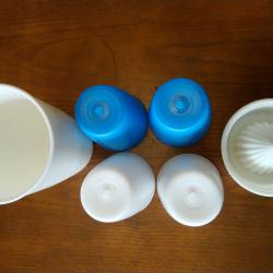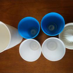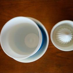 Туристически комплект чаши със сокоистисквачка от мек полимер. Произход България около 1985 г. Комплектът съдържа: 1. Голяма чаша с размери ф50*115*ф70 мм.. 2.4 броя малки чаши с размери ф38*75*ф56 мм.. 3. Капак сокоистисквачка с размери ф76*40 мм.. Размери в затворено положение ф50*140*ф76 мм.. |