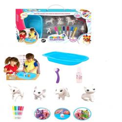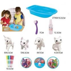 Комплект животинки с възможност за постоянно персонализиране / Размери: Размер на пуделчето: 5х7 см; Размер на кученцето с вирната опашка: 6,5х5,5 см; Размер на котето: 6х4,5 см; Размер на зайчето: 4,5х5 см; Размер на маркерите: 10,5 см; Размер на четчицата: 7 см; Размер на цялата кутия: 32,5х23,5 см; Цвят на животинките: Бял основен цвят; Цвят на маркерите: По един от всеки от следните цветове – жълт, лилав, светло зелен, червен, оранжев, светло син;