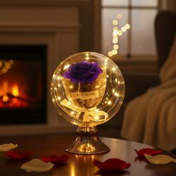 Тип: декоративна LED лампа в прозрачен купол; Захранване: USB зареждане; Управление: превключвател (вкл. /изкл.); Светлина: мека/топла (мини LED гирлянд вътре); Цветове на розата: червено / лилаво / розово; Размери: височина 19.50см, диаметър на сферата 11см, диаметър на основата 9.50см; Корпус: прозрачна сфера + златиста стабилна основа; Надпис: „BEST WISH“ („Най-добри пожелания“); Гаранция: 12 месеца. |