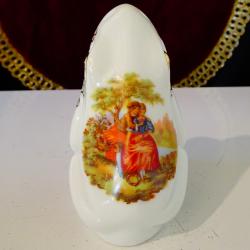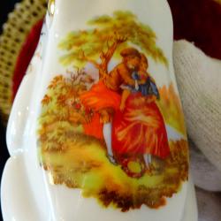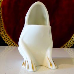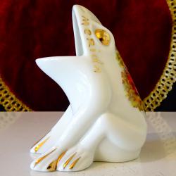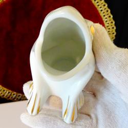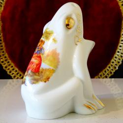 Стара френска порцеланова фигура Жаба, поставка за клечки за зъби, ваза, ръчно рисувана с картина на френският художник Антоан Вато и злато 24 карата. Височина 9.5 см., дължина 7 см., ширина 6 см. Маркирана с инициалите на световно известната френска марка Fragonard. Перфектна.