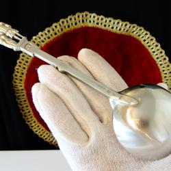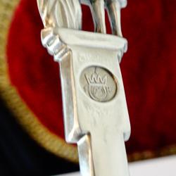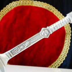 Старинна немска калаена лъжица, майсторска ръчна изработка от 95% калай и 5% сребро, маркирана със знак за високо качество. Декорирана с релефни фигури на мъж и жена, хванати под ръка, семейство, съпрузи, изправен лъв с корона, ангелско лице и щъркел – все символи за щастлив семеен живот, здраве и благоденствие. Лъжицата е предназначена за калаена сватба. Високо качество, масивност и сребърен блясък. Дължина 18 см., ширина 5.5 см., тегло 70 гр.