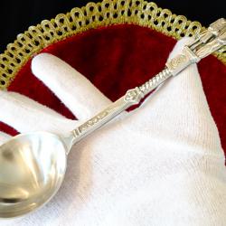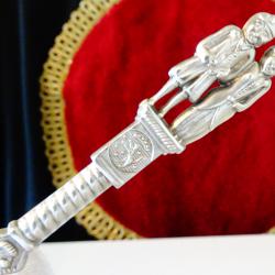 Калаена лъжица с фигури на съпрузи, ангел, щъркел, калаена сватба.
