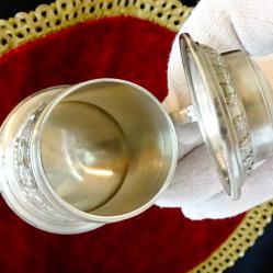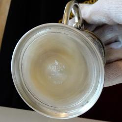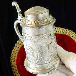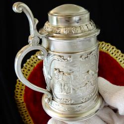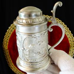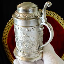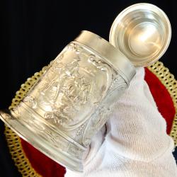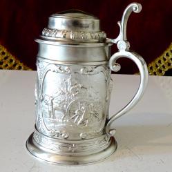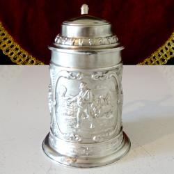 Стара немска калаена халба, майсторска ръчна изработка от 95% калай и 5% сребро, маркирана с инициалите на световно известната фабрика Artina SkS. Декорирана с три прецизно изваяни ребефни картини от селския бит – Оран с Кон и рало, Сеитба, Жътва с Кон и пълна каруца. Картините са разделени с житен клас и красиви барокови орнаменти. Височина 9 см., диаметър 5.5 см., тегло 140 гр. Вместимост 130 мл.