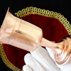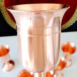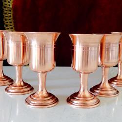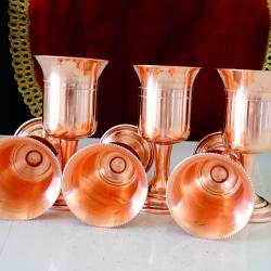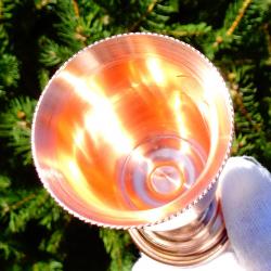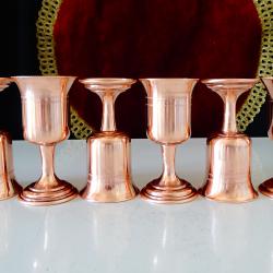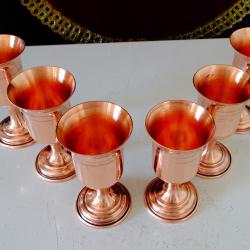 Старинни медни чаши за ракия, повдигнати на столче, майсторска ръчна изработка от чиста червена мед с ослепителен блясък. Ефектно декорирани с нежен релеф. От вътре не са калайдисани, идеални за ползване. Звънят приятно и празнично, като звънчета. Височина 9 см., диаметър 4.5 см., тегло на всяка 50 гр. Вместимост 60 мл. Налични 6 броя, цена 26 лв., за брой. Имам ръчно кована медна кана за ракия, която може да разгледате в моите обяви |
