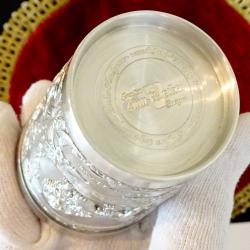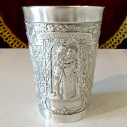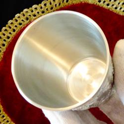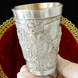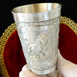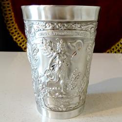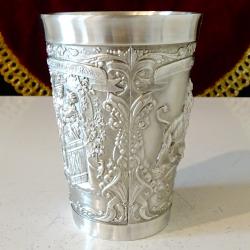 Стара немска калаена чаша за вино, майсторска ръчна изработка от 95% калай и 5% сребро, маркирана от производителя. Декорирана с три прецизно изваяни релефни картини с млада влюбена двойка, богиня Фортуна с рог на изобилието и горд Лъв с буйна грива. Изображенията са разделени от приказно красиви барокови орнаменти. Височина 8.5 см., диаметър 6 см., тегло 130 гр. Вместимост 160 мл. Чашата блести от вън и от вътре, идеална за ползване, декорация и подарък за калаена сватба, рожден ден за зодия Лъв.