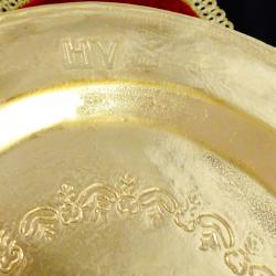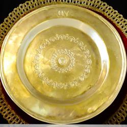 Старинна чиния за стена, пано, плато, фруктиера, съд за сервиране, ръчно отлята от свръх масивен бронз. Вечен съд с високо качество и дебела позлата. Маркирана от производителя HV. Декорирана с релефни орнаменти. Има стабилна окачалка за стена. Диаметър 27 см., височина 1.6 см., тегло 850 гр.