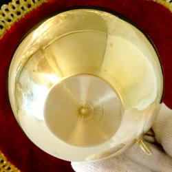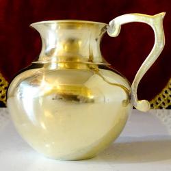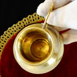 Старинна кана за ракия, каничка за мляко, латиера, ръчно отлята от високо качествен масивен бронз. Има ефектна извита дръжка. Вечен съд със златен блясък. Височина 8 см., диаметър 8 см., тегло 130 гр. Вместимост 180 мл.