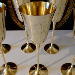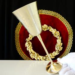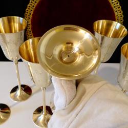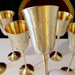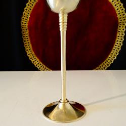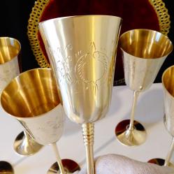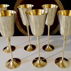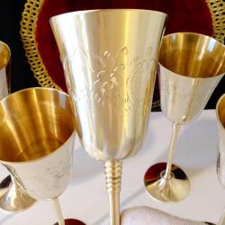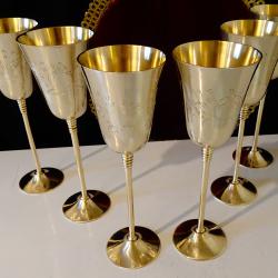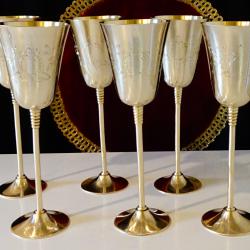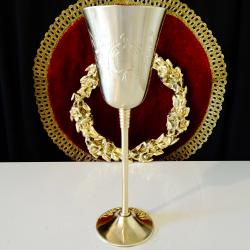 Старинен бокал за вино, шампанско, висока чаша на столче, майсторска ръчна изработка от високо качествен бронз с огледална гладкост и златен блясък. Декориран с прецизно изваяни барокови орнаменти и цветя. Повдигнат на високо и елегантно релефно столче. Звъни звучно, празнично. Перфектно състояние, идеален за ползване, декорация, подарък и сватбена чаша. Височина 23 см., диаметър 8 см., тегло на всеки 250 гр. Вместимост 220 мл.