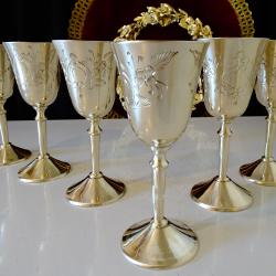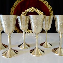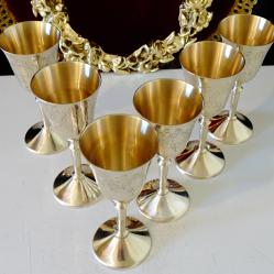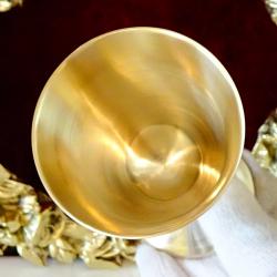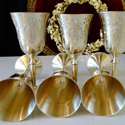 Стари бронзови чаши на високо столче, за ракия, ликьор, майсторска ръчна изработка от високо качествен масивен бронз. Декорирани с прецизни релефно гравирани барокови орнаменти и цветя. Чашите блестят като златно огледало и звънят като празнични звънчета. Височина 13 см., диаметър 5.5 см., тегло на всяка 110 гр. Вместимост 100 мл. Налични 6 броя, цена 29 лв., за брой.