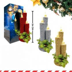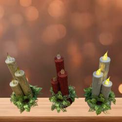 Височина на свещите: 24 см;  LED светлина с реалистичен, пулсиращ пламък; Три цвята: златисто, сребристо и червено; Покритие с блясък, създаващо празнична атмосфера; Енергоспестяваща и безопасна LED технология; Гаранция: 12 месеца. |