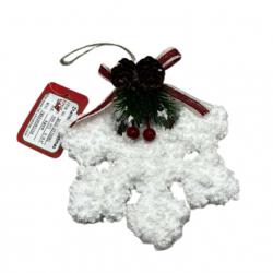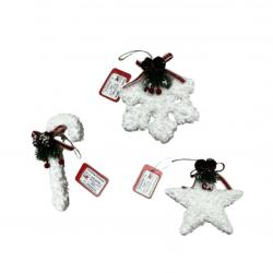 Материал: Плюшени влакна и декорации от изкуствени борови клони, шишарки и плодчета;  Размери: 10-12 см в зависимост от формата; Закрепване: Всяко украшение има прикрепена връв за лесно поставяне на елхата; Вариант 1: Звезда; Вариант 2: Снежинка; Вариант 3: Захарно бастунче. |
