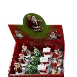 Материал: соев восък, пчелен восък и парафин;  Размери (приблизително): 2.50 см ширина x 7 см височина; Продължителност на горене: 5 - 8 часа; Аромат: Лек, приятен аромат; Вариант 1: 3 х Дядо Коледа, 3 х елха, 3 х снежна къща, 3 х снежен човек; Вариант 2: 3 х коледен ботуш, 3 х шишарка, 3 х коледна шапка, 3 х елха; Вариант 3: 3 х Дядо Коледа, 3 х Снежен човек, 3 х глава на Дядо Коледа, 3 х глава на снежен човек. |