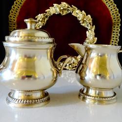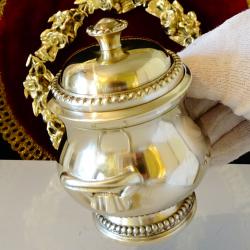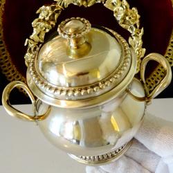 Стара бронзова захарница, ръчно отлята от свръх масивен и качествен бронз с кристална гладкост и златен блясък. Вечен съд, декорирана с ефектен перлен релеф, много красив дизайн издържан в стил Луи XVI – ти. На мен ми прилича на кралски дворец. Височина 11 см., дължина с дръжките 12 см., диаметър 9 см., тегло 330 гр. Вместимост 200 мл. Имам каничка от този сервиз, която може да разгледате в моите обяви. |