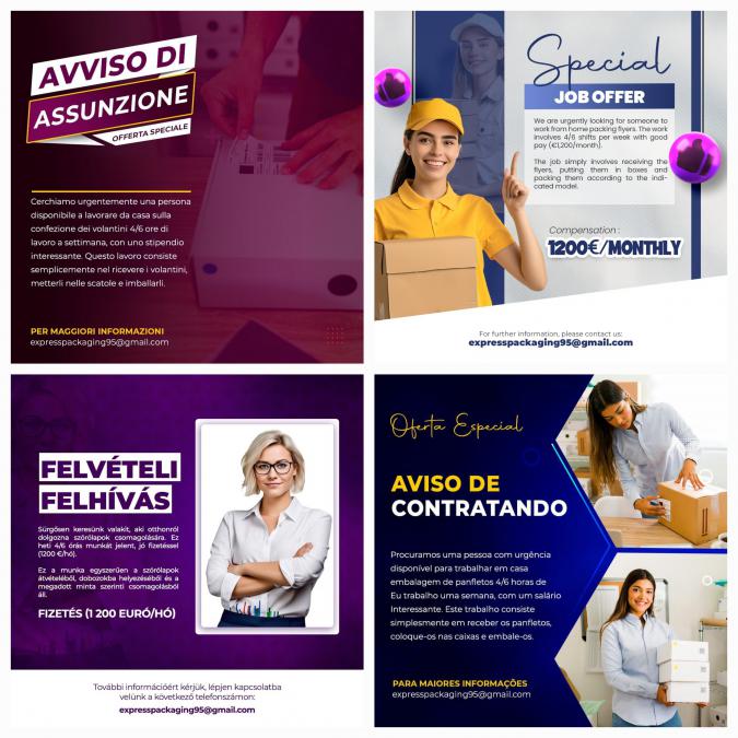Ние сме компания, специализирана в управлението и разпространението на рекламни материали. Като част от нашата дейност, редовно набираме служители за задачи по опаковане, сортиране и опаковане на листовки от дома. Нашата цел е да предложим гъвкави възможности за работа, достъпни за всеки сериозен, организиран и мотивиран човек. Материалите (листовки и аксесоари за опаковане) се доставят директно до дома на служителя, а вземането им се извършва всяка седмица от шофьор, назначен от нашия логистичен екип. Заплащането се базира на обработения обем и се изплаща след всяко вземане. Това е 4/6 работна седмица с добро заплащане (€1200/месец). Ако търсите стабилна и лесна за изпълнение работа, която отговаря на вашите възможности, ще се радваме да работим с вас. За повече информация, моля, свържете се с нас на: expresspackaging95@gmail. com Вашето местоположение не е важно. |