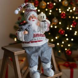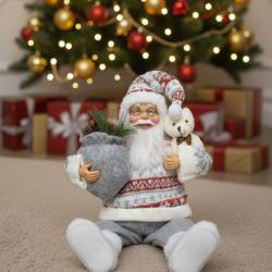 Технически характеристики Материали: текстил, пластмаса; декорация от елхови клонки и шишарка Размер: около 40 см Цветове: сиво, бяло, червено Безопасност: подходящ за семейства с деца (няма остри ръбове) Допълнителни елементи: мече, торба с декорация Подходящ за: елха, шкаф, камина, офис, входно антре Опаковка: защитна опаковка, готов за подаряване |