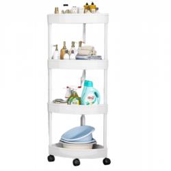 Модел: Corner Storage Rack; Височина: 84см; Материал: висококачествена пластмаса + метални тръби; Конструкция: ъглова, въртяща се на 360°, с универсални колелца; Нива: 4; Подходяща за: баня, кухня, хол, спалня; 21 cm → 21 см (разстояние между нивата); 34.5 cm → 34,5 см (ширина); Цвят: Черен, бял; Функции: бързо оттичане на вода, стабилна структура, лесно почистване. |