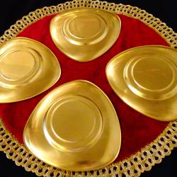 Стари чинии за хапки, гурме, подложни чинии за чаши, чинии за десерт, изработени от високо качествен як месинг с позлата. Имат триъгълна форма. Диаметър 15 см., височина 1 см., тегло на всяка 50 гр. Налични 4 броя, цена за всички 16 лв. /8.19€